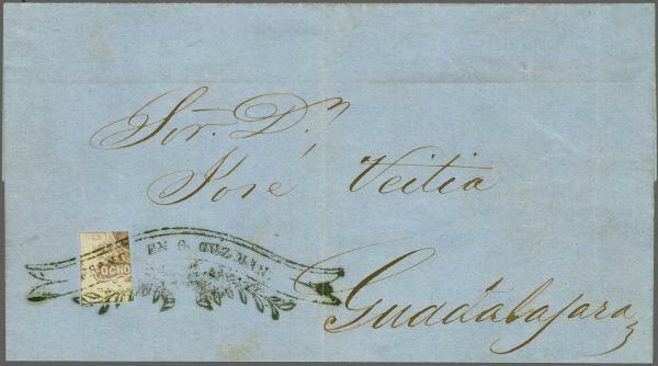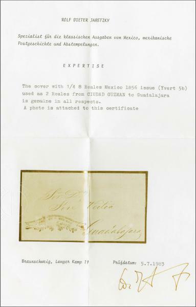 | Zusatzinformationen und Suchstichworte: | 309. - 320. Corinphila Auktion 24. November - 2. Dezember 2023 Los 852 Mexiko Guadalajara 1856: 8 r. red-lilac, a quadrisected examople used to pay the 2 reales rate, used on cover from Cuidad Guzman to Guadalajara tied by superb strike of fancy framed "FRANCO EN C. GUZMAN" in black (Schatzkes fig. 340). A most attractive usage. Cert. Jaretzky (1983).rnrnProvenance: Collection Mondolfo, Corinphila sale 70, March 1984, lot 3226 Ausruf 150,00 CHF |