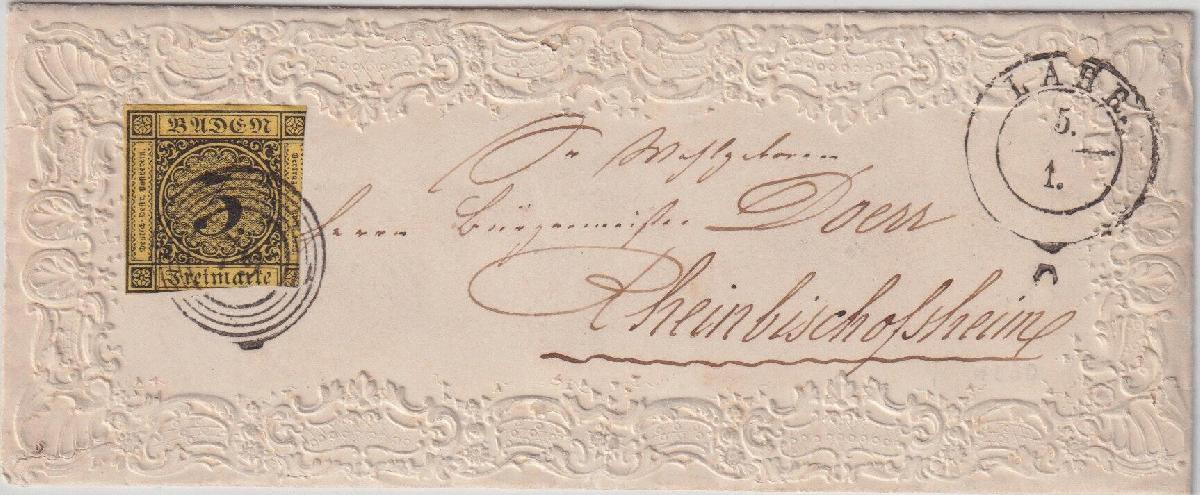 | Zusatzinformationen und Suchstichworte: | Südphila Peter Feuser 99. Auktion 17. November 2023 Los 1038 Altdeutschland Baden 3 Kr. a. orangegelb (Schnittfehler) mit Stempel "79" Lahr auf dekorativem Prägezierbrief (kl. Mängel) nach Rheinbischofsheim Zuschlag 210,00 EUR |