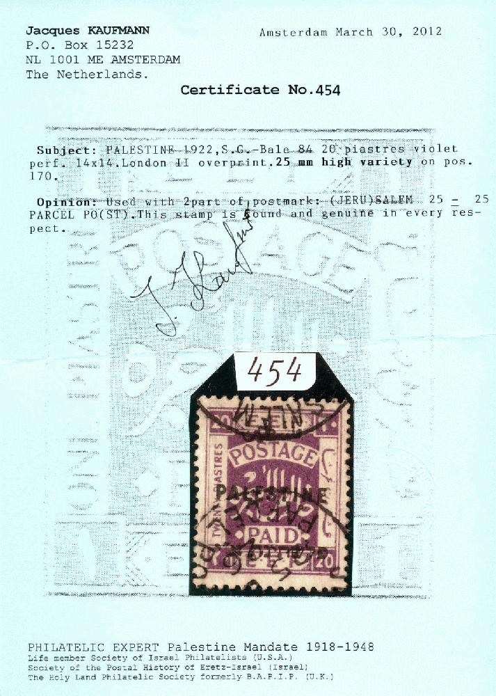 | Zusatzinformationen und Suchstichworte: | 21. classicphil GmbH Auktion 06.-07. Dezember 2023 Los 2758 Palästina 1922,20 pi., violett, gezähnt 14, London II Überdruck in schwarz, 25 mm hoch Abart auf Position 170, sehr selten und dekorativ, Attest Kaufmann und Muentz, Pracht! Schätzpreis 800 EUR Ausruf 240,00 EUR |