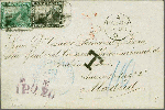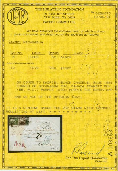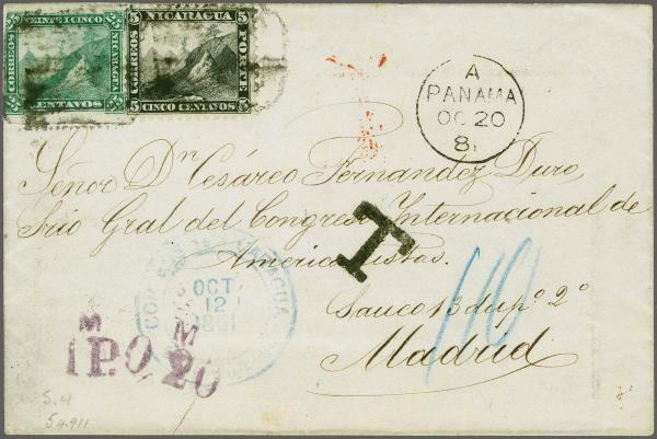 | Zusatzinformationen und Suchstichworte: | 309. - 320. Corinphila Auktion 24. November - 2. Dezember 2023 Los 7675 Nicaragua 1869-71: Liberty Cap on Mountain, 5 cts. black and 25 cts. green, used on cover, from CHINANDEGA (Nicaragua) to MADRID (Spain), tied by black cancel, with blue double circle 'CORREOS DE MANAGUA' alongside (12 Oct 1881), British Post Office 'PANAMA' datestamp in black (20 Oct 1881), two Spanish charge marks 'M/1P' and 'M/0,20' in violet, addressed to Fernades Duro, philatelic writer of the time, Secretary General of the International Congress, London transit on reverse in red (11 Nov 1881) and a Madrid arrival the date indistinguishable, a very fine cover, extremely rare, more so to Spain with such a combination of rare stamps. Cert. PF (1991) Gi = $13'500 (as singles on cover) Ausruf 4.600,00 CHF |