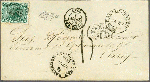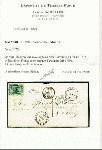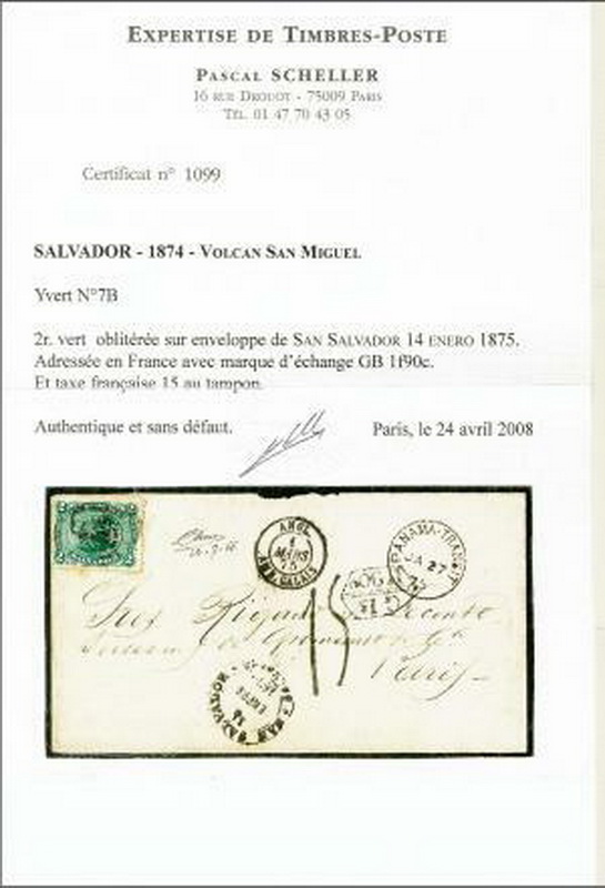 | Zusatzinformationen und Suchstichworte: | 309. - 320. Corinphila Auktion 24. November - 2. Dezember 2023 Los 1071 Salvador 1874: 2 r. green, optd. by small 'Contra Sello 1874' in black, used on 1875 cover to Paris cancelled by framed FRANCO handstamp, with 'San Salvador / Salvador' despatch cds (Jan 14) in black. Circular 'PANAMA / TRANSIT' datestamp of transit (Jan 27) in black, thence via London (March 1) where framed "GB / 1F 90c." Accountancy marking applied in black. Charged '15' décimes on arrival A very rare stamp on letter Ausruf 300,00 CHF |