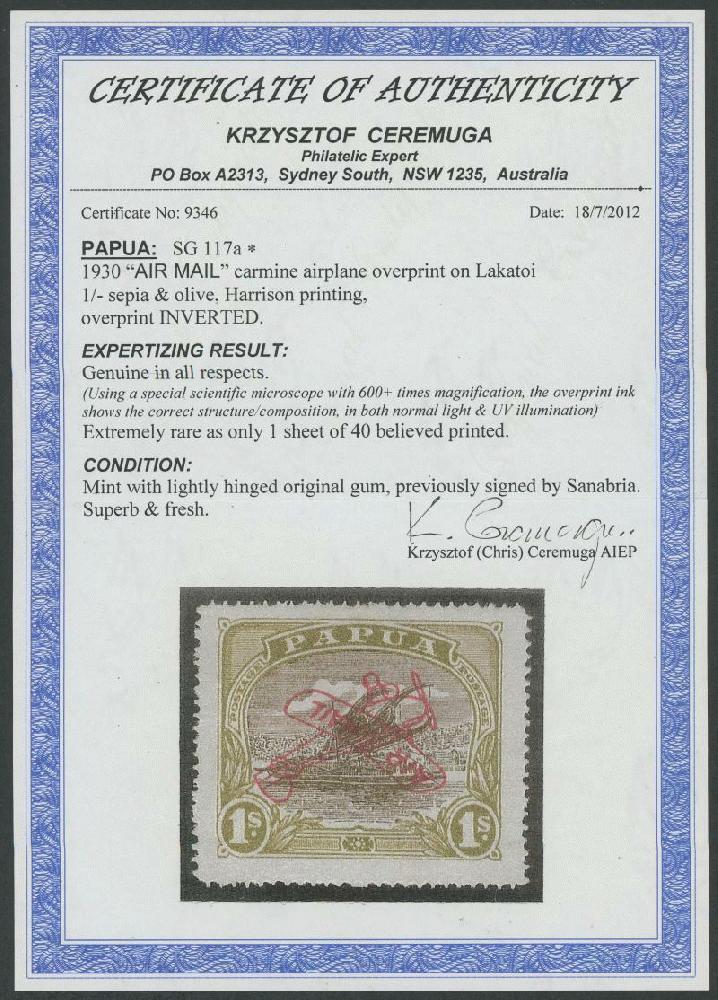 | Zusatzinformationen und Suchstichworte: | 254. Abacus Auktion 6. - 8. Dezember 2023 Los 3502 Papua 1930 Flugzeug Überdrucke Harrison Drucke 1/- sepia und oliv mit der Überdruck kopfstehend SG 117a, gut zentriert, ein paar charakteristisch unregelmässig Zähne, garantieren Handstempel von Sanabria - wer ursprüngliche aufgesplittet der Bogen von 40 - und Gibbons (New York), Katalogwert £15,000. BPA (1961, als die dann SG 123ab) und Chris Ceremuga (2012) Atteste. Bedeutend besseres zentriert als die Exemplar verkauft zu unser Versteigerung von 1,3,2020 für $10, 620 Ausruf 7.500,00 AUD |