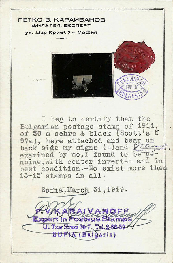 | Zusatzinformationen und Suchstichworte: | Kelleher 791. Auktion 13. - 16. November 2023 Los 192 Bulgarien 1911, Pictorials, 50s ocher & black, center inverted (Scott 97a), Post Office fresh with clean color on pristine paper, the Tsar & Princes turned upside down; partial strike of Philippople c.d.s. (as found on all existing examples), Very Fine, signed Karaivanoff, with his 1949 certificate (wax seal and all!). Zuschlag 4.250,00 USD |