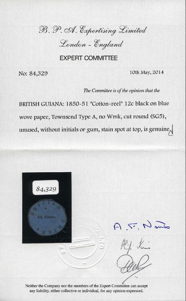 | Zusatzinformationen und Suchstichworte: | David Feldman S.A. - Great Britain and British Empire 6. Dezember 2023 Los 30271 Britisch Guyana Ein von drei ungebraucht 12 CENTS verzeichnet 1850-51,12 cents schwarz auf blau, Townsend Typ «A», dick Rahmen, ohne Initialen, rund geschnitten mit dem Kreis umrandet der Briefmarke zu sein sichtbarer ringsum, kleiner Stockfleck Fleck oben, in einer ungewöhnlich tiefe, kräftige Farbe; (ohne Preis in SG). Eine von nur vier ungebraucht bekannten Stücken im "Cotton-Reel" primitives, dieses zu sein ein von drei repräsentierend die 12 cents (die anderen zwei mit Initialen, ein verkaufte im hintere Verkauf in 1935, die anderen angehörend die J. Simon Greenwood Sammlung) ; eine der großartig ungebraucht Raritäten des britisches Imperium Ausruf 40.000,00 GBP |