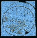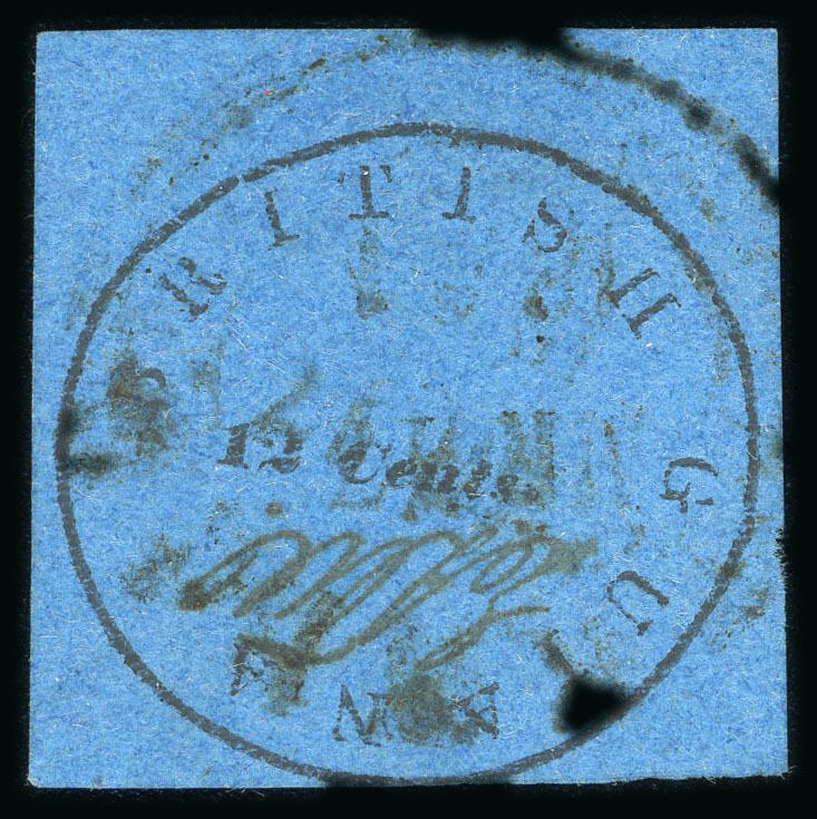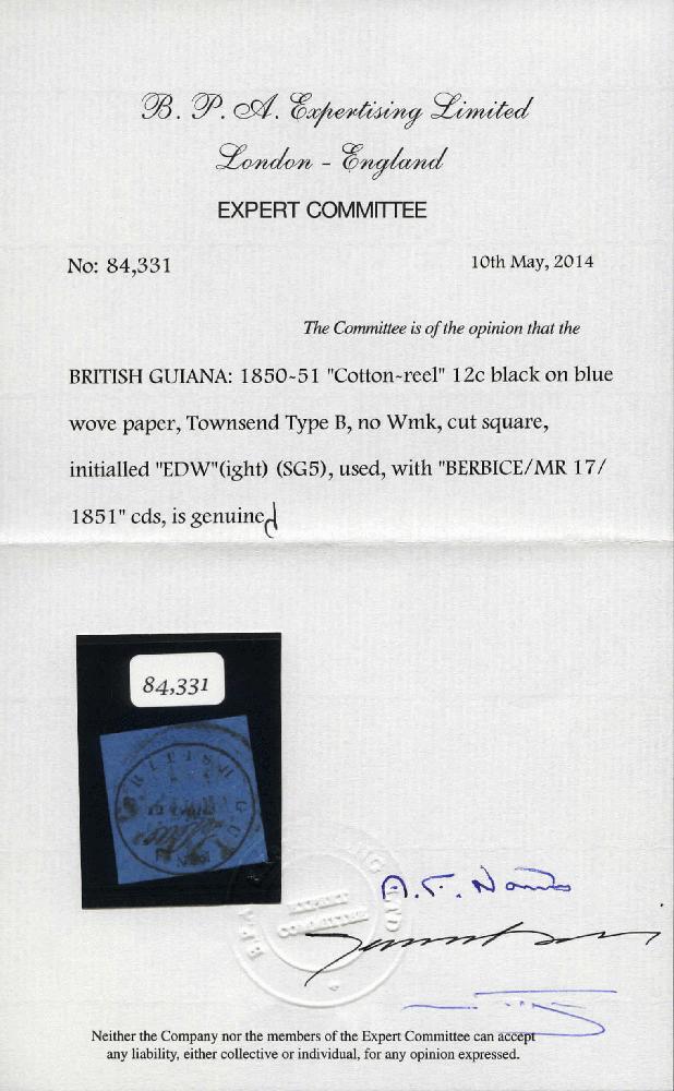 | Zusatzinformationen und Suchstichworte: | David Feldman S.A. - Great Britain and British Empire 6. Dezember 2023 Los 30272 Britisch Guyana 1850-51,12 cents schwarz auf blau, auf dickem Papier, Townsend Type B, mit Initialen des Postbeamten Wicht "EDW", rechteckiger Ausschnitt voll- bis überrandig auf drei Seiten, kaum berührt unten, entwertet durch zarten Abschlag von Berbice Datumsstempel; (SG £35000). Eine von nur ungefähr acht 12 cents rechteckiger Ausschnitt Stücke ohne Mängel Ausruf 7.000,00 GBP |