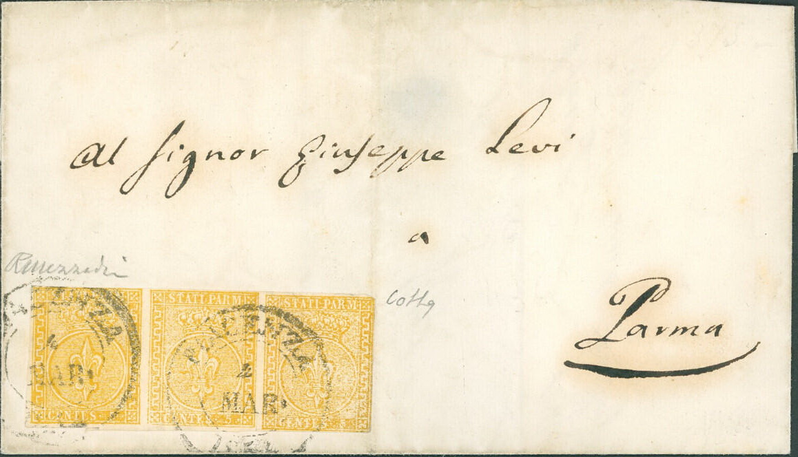| Zusatzinformationen und Suchstichworte: | Stampcurio 1. Auktion 1. Januar 2024 Los 47 Italien Staaten Parma 1853 Italy / Parma - Envelope posted in Piacenza with 5c triple stripe (!) Ausruf 600,00 EUR |