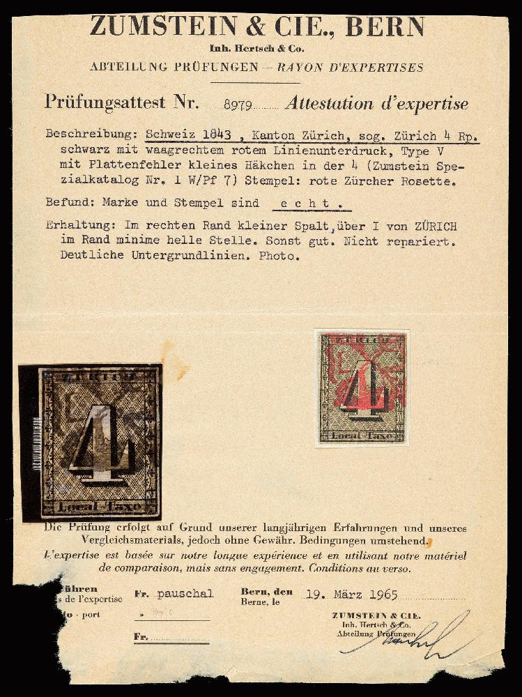 | Zusatzinformationen und Suchstichworte: | R&J Stamp - 1. Auktion 09. Dezember 2023 Los 4 Schweiz Kanton Zürich 1846: Zürich 4. Sehr saubere und farbfrische Type V mit Plattenfehler 5a; Häkchen in der «4» (+ CHF 3000.–). Selten, nur jede hundertste Marke mit dieser markanten Abart. Gut sichtbare Hintergrundlinien. Helle Stelle, Randrisschen, aber gut gerandet und nicht repariert, eine schöne Marke. FA Hertsch + Berra. Katalogwert ca. CHF 35000.00 Ausruf 5.000,00 CHF |