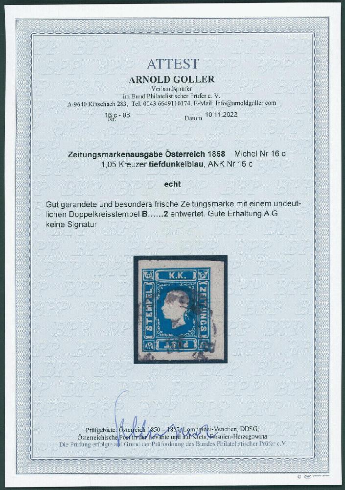| Zusatzinformationen und Suchstichworte: | Stampcurio 1. Auktion 1. Januar 2024 Los 201 Österreich 1858 Österreich - tiefdunkelblaue (tiefdunkelblau) Zeitungsmarke Ferchenbauer 1100 € - Prüfbefund Goller Ausruf 150,00 EUR |