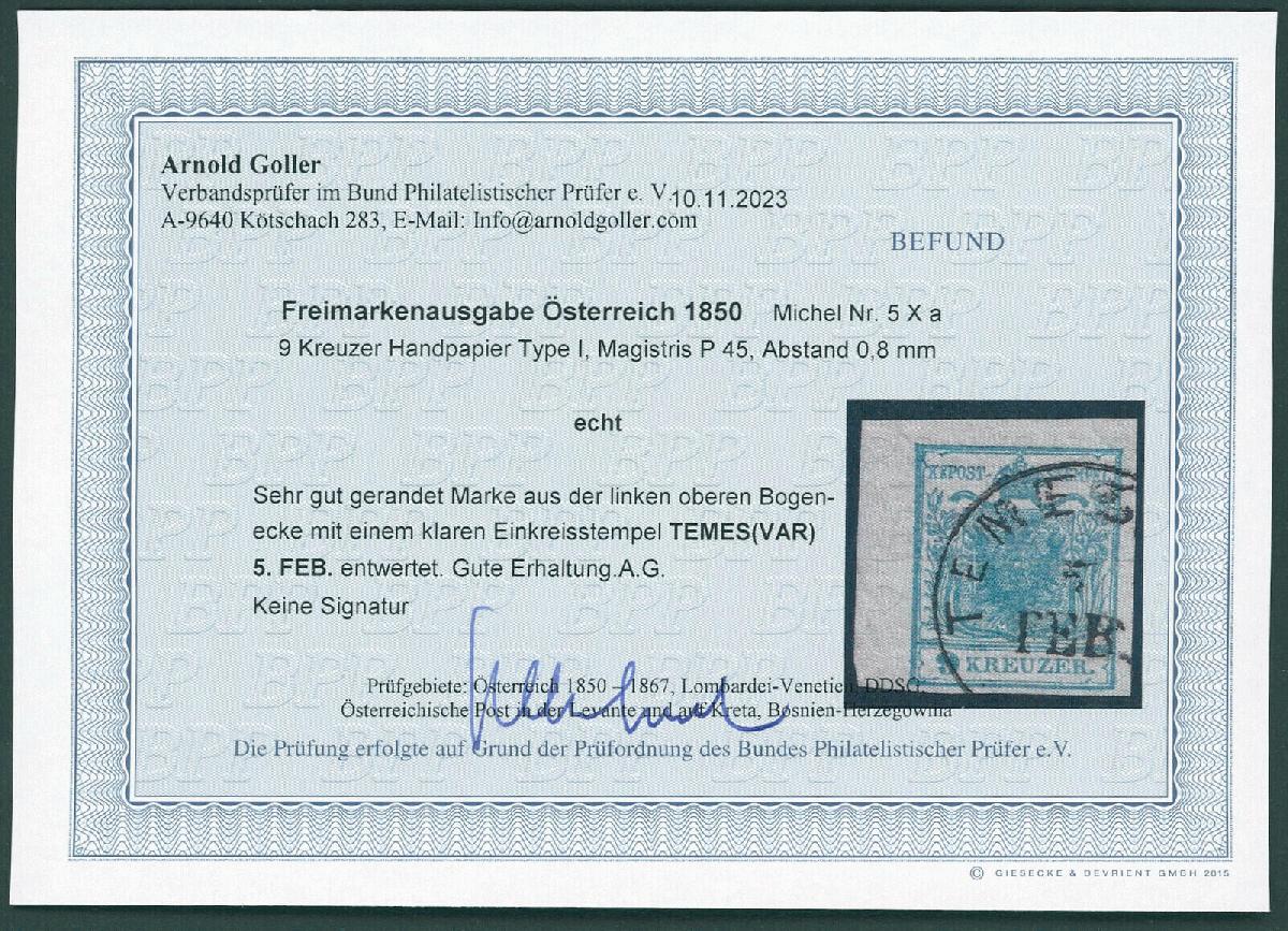 | Zusatzinformationen und Suchstichworte: | Stampcurio 1. Auktion 1. Januar 2024 Los 216 Österreich 1850 Austria 9 Kr Type I. - Magistris P45 - Abstand 0, 8mm und Rand + Platte Fehler und TEMESVÁR Poststempel - Ferchenbauer 180 € - Attest Goller Ausruf 50,00 EUR |