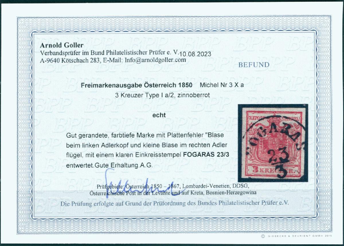 | Zusatzinformationen und Suchstichworte: | Stampcurio 1. Auktion 1. Januar 2024 Los 369 Österreich 1850 Österreich/Siebenbürgen 3 Kr Type I ein/2. zinnober mit Doppelplatte Fehler die detailliert in Attest - FOGARAS Poststempel - Ferchenhauer 210 + EUR Ausruf 80,00 EUR |