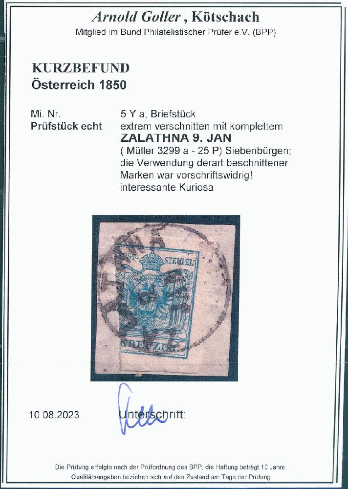 | Zusatzinformationen und Suchstichworte: | Stampcurio 1. Auktion 1. Januar 2024 Los 372 Österreich 1850 Österreich/Siebenbürgen - äußersten Vortrennschnitt 9 Kr mit ZALATHNA Poststempel Gudlin 150p Mueller 25p - arglistig Frankatur - Prüfbefund Goller Ausruf 50,00 EUR |