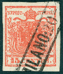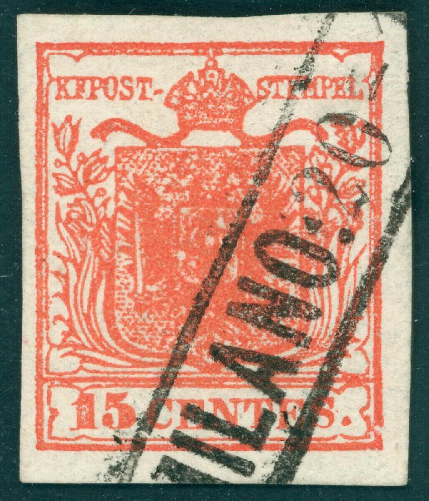 | Zusatzinformationen und Suchstichworte: | Stampcurio 1. Auktion 1. Januar 2024 Los 373 Österreich Lombardei Venetien 1850 Austria - Lombardy–Venetia 15c type I/2 dark vermilion MILANO postmark - Ferchenbauer 40 EUR - Attest Goller Ausruf 15,00 EUR |