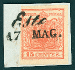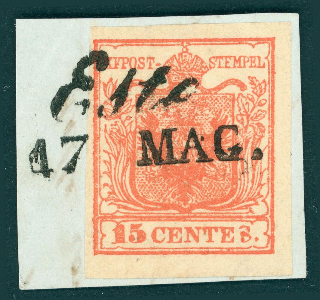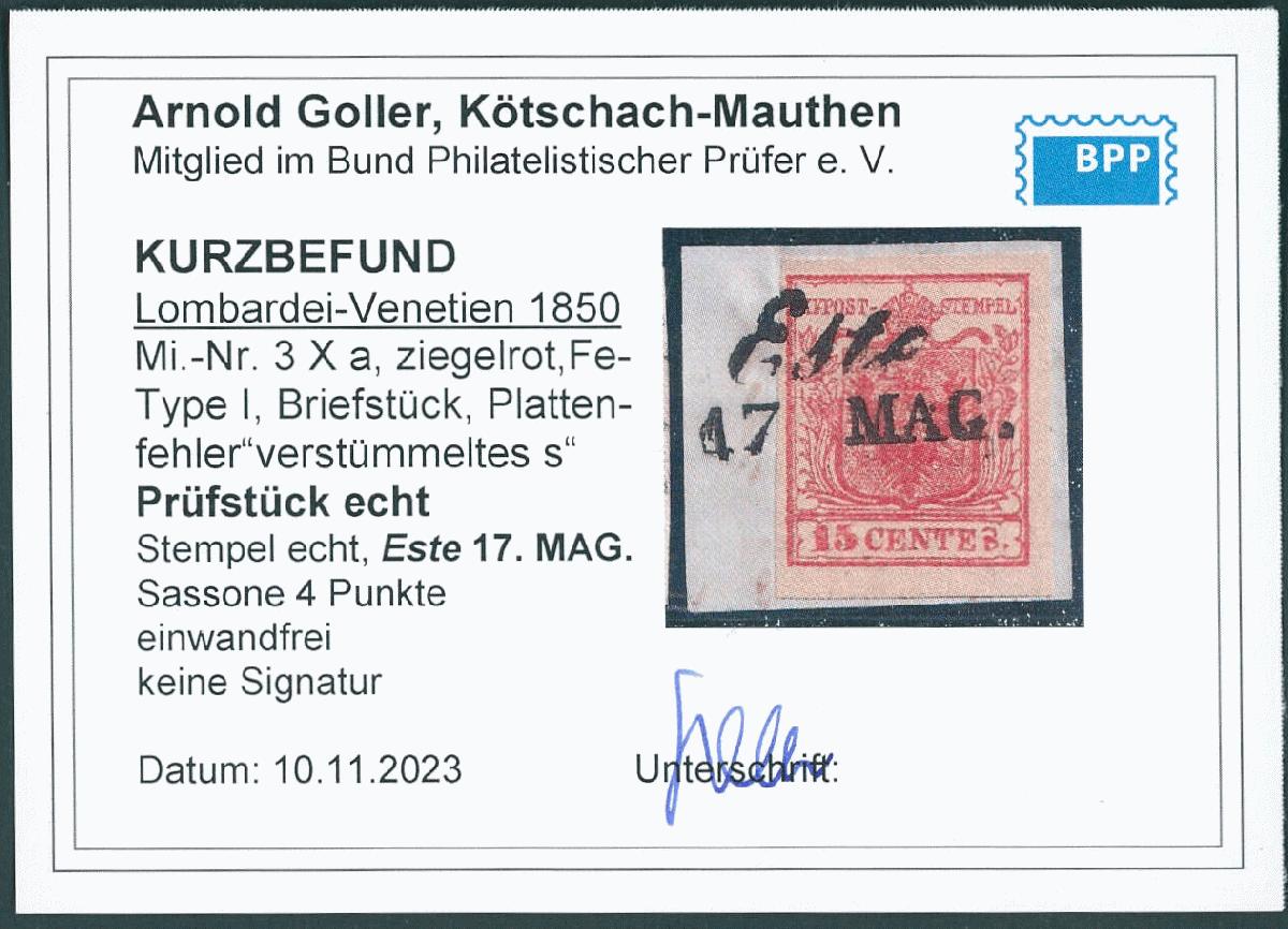 | Zusatzinformationen und Suchstichworte: | Stampcurio 1. Auktion 1. Januar 2024 Los 374 Österreich Lombardei Venetien 1850 Österreich - Lombardy–Venetia 15c Type I ziegelrot - Platte Fehler in Brief S - ESTE Poststempel - Prüfbefund Goller Ausruf 15,00 EUR |