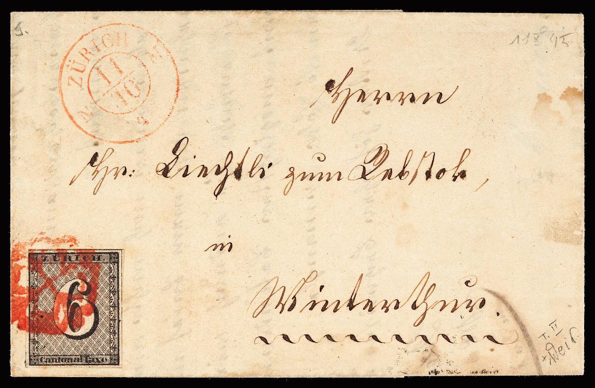 | Zusatzinformationen und Suchstichworte: | R&J Stamp - 1. Auktion 09. Dezember 2023 Los 2 Schweiz Kanton Zürich 1843: Zürich 6. Voll- bis breitrandige Marke des Types II von Feld 2 mit gut sichtbaren Untergrundlinien auf vollständigem Faltbrief von Zürich nach Winterthur, entwertet mit roter Zürcherrossette, nebenan roter 2-Kreiser «Zürich 11/10 45». Links neben der Zahl 6 befindet sich ein kleiner natürlicher Körpereinschluss. Ein schöner klassischer Altschweizbeleg. Attest v. d. Weid. Katalogwert ca. CHF 6000.00 Ausruf 2.200,00 CHF |