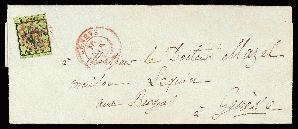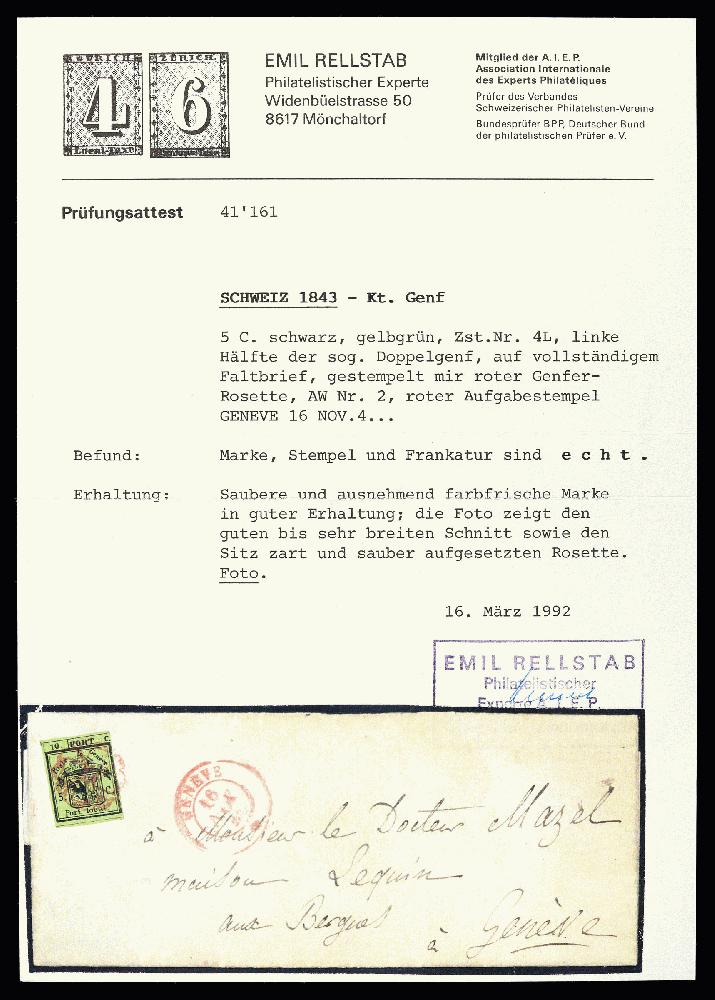 | Zusatzinformationen und Suchstichworte: | R&J Stamp - 1. Auktion 09. Dezember 2023 Los 6 Schweiz Kanton Genf 1843: Halbe Doppelgenf (links). Faltbrief im Ortsrayon, frankiert mit allseitig gut bis sehr breit geschnittener, linker Doppelgenfhälfte. Die ausnehmend farbfrische Marke übergehend entwertet mit zarter, sauber aufgesetzter, roter Genfer Rosette, nebenstehend roter Aufgabestempel «Genève 16 Nov. 4...». Ein schöner, ausgesprochen sauberer Beleg mit wunderschöner Kalligrafie. Ein optisch kaum zu übertreffendes Stück. Attest Rellstab. Katalogwert ca. CHF 23000.00 Ausruf 10.000,00 EUR |