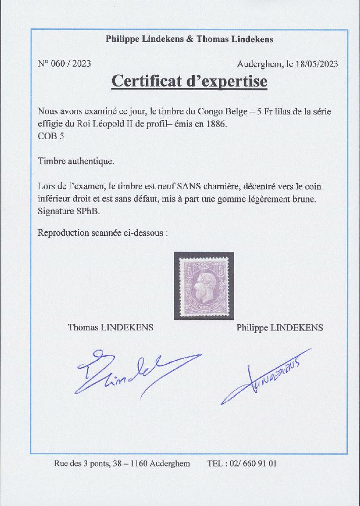 | Zusatzinformationen und Suchstichworte: | 175. Van Looy Auktion 16. - 21. Oktober 2023 Los 2558 Belgisch-Kongo N° 5 5 Fr. lila, nach rechts unten dezentriert, postfrisch, mit ursprünglichem Gummi leicht getönt, signiert SPHB, selten, mit Attest, Pracht (OBP € 1,650) Ausruf 290,00 EUR |