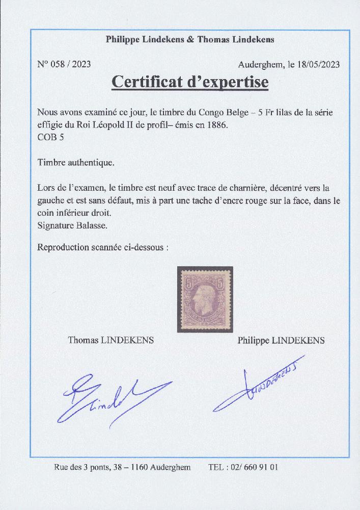 | Zusatzinformationen und Suchstichworte: | 175. Van Looy Auktion 16. - 21. Oktober 2023 Los 2561 Belgisch-Kongo N° 5 5 Fr. lila, nach links dezentriert, signiert mit Attest, rote Farbe auf der Vorderseite, auf rechte untere Ecke, Pracht/f (OBP € 785) Ausruf 80,00 EUR |