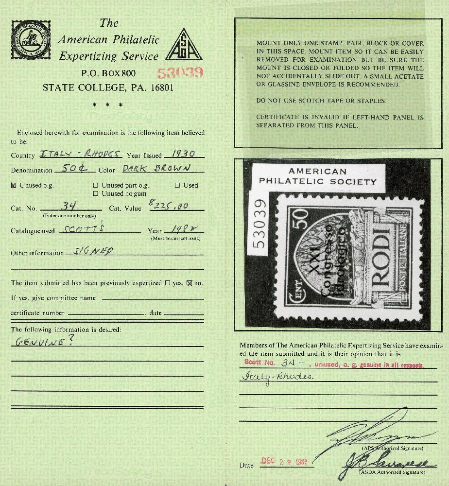 | Prüfer: | APS, (American Philatelic Society) (Prüferkommission) |