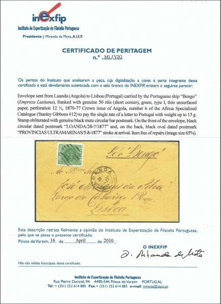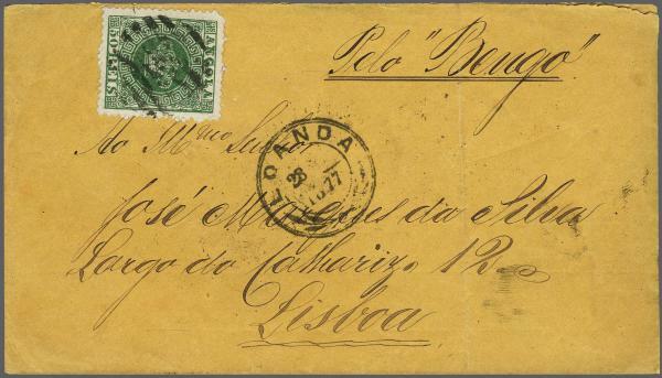 | Zusatzinformationen und Suchstichworte: | 309. - 320. Corinphila Auktion 24. November - 2. Dezember 2023 Los 3090 Angola Angola 1877: Cover from Luanda to Lisbon endorsed "per Bengo" of Empresa Luzitana line, franked by 1870/7 Crown 50 r. green, Type I on thin paper, perf. 12½ (Scott 6), one rounded corner perf., tied by barred obliterator in black. "LOANDA" cds below (July 28) in black and reverse with oval framed "Provincias / Ultramarinas" datestamp (Aug 5) in black. Rare but the cover sadly affected by some recent water damage in the post together with the certificate by Miranda da Mota AIEP (2010) Ausruf 200,00 CHF |