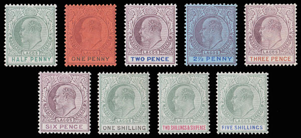 | Zusatzinformationen und Suchstichworte: | Kelleher 791. Auktion 13. - 16. November 2023 Los 76 Lagos 1904, König Edward VII, ½d-10s komplett (Scott 40-49), Krone CA Wasserzeichen, Originalgummi, kleiner Falz, ungewöhnlicher leuchtend frisch, Pracht, die 10er mit ein 1976 P. F. Attest. SG 44/53; £650 ($840). Scott $756. Zuschlag 250,00 USD |