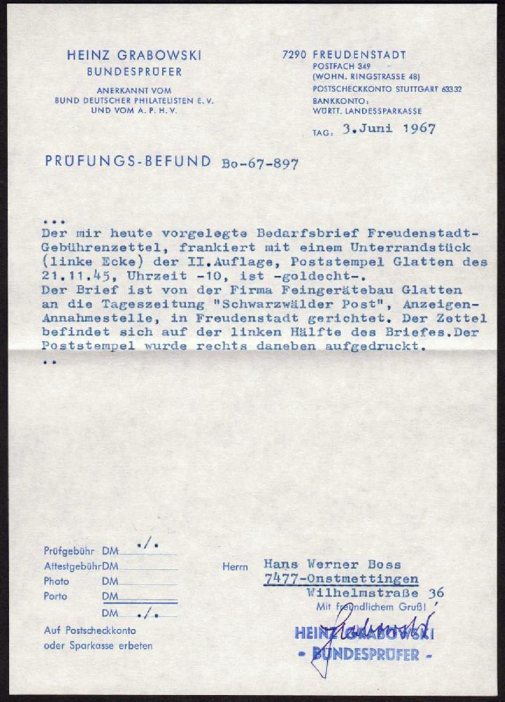 | Prüfgebiet: | Deutsche Lokalausgaben 1945 Freudenstadt |