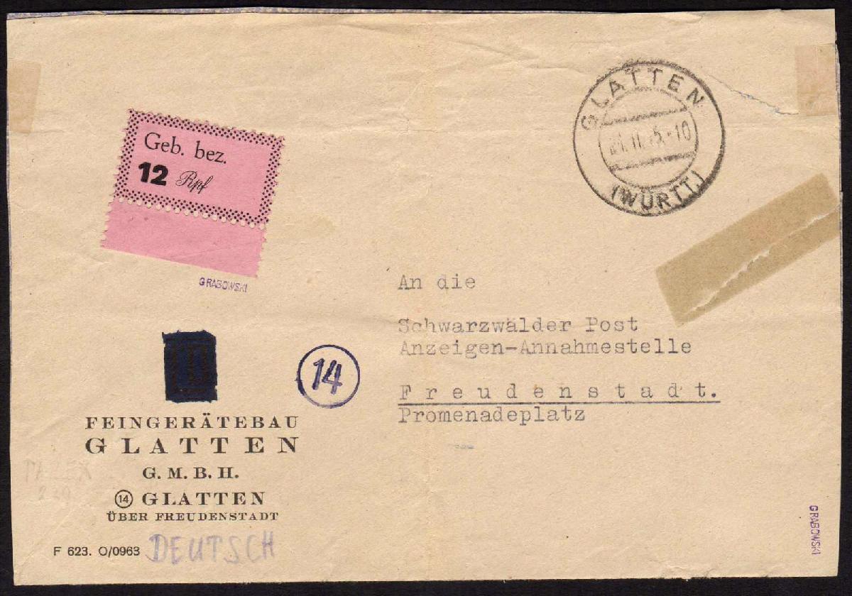 | Zusatzinformationen und Suchstichworte: | 111. Briefmarken Lenz Auktion 6. - 9. November 2023 Los 6468 Deutsche Lokalausgabe Freudenstadt FREUDENSTADT, 12 Pf. Gebührenzettel mit Rand, auf 3-seitig geöffneten Bedarfsbrief (Mängel) aus "Glatten 21.11.45" nach Freudenstadt, Befund Grabowski, Mi.350,- Zuschlag 50,00 EUR |