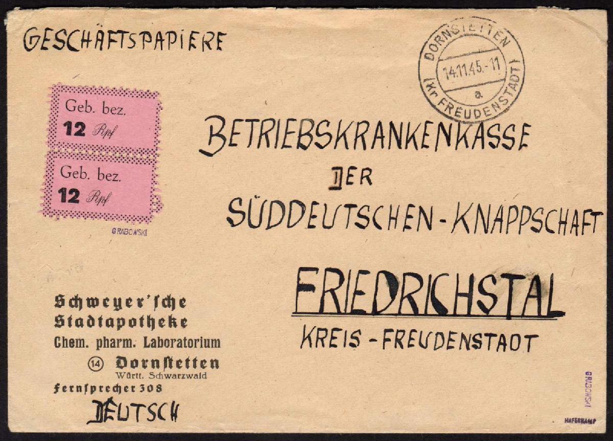 | Zusatzinformationen und Suchstichworte: | 111. Briefmarken Lenz Auktion 6. - 9. November 2023 Los 6472 Deutsche Lokalausgabe Freudenstadt FREUDENSTADT, 12 Pf. Gebührenzettel, senkrechtes Paar auf Brief aus "Dornstetten 14.11.45" nach Friedrichstal, Bedarf, Befund Grabowski Ausruf 80,00 EUR |