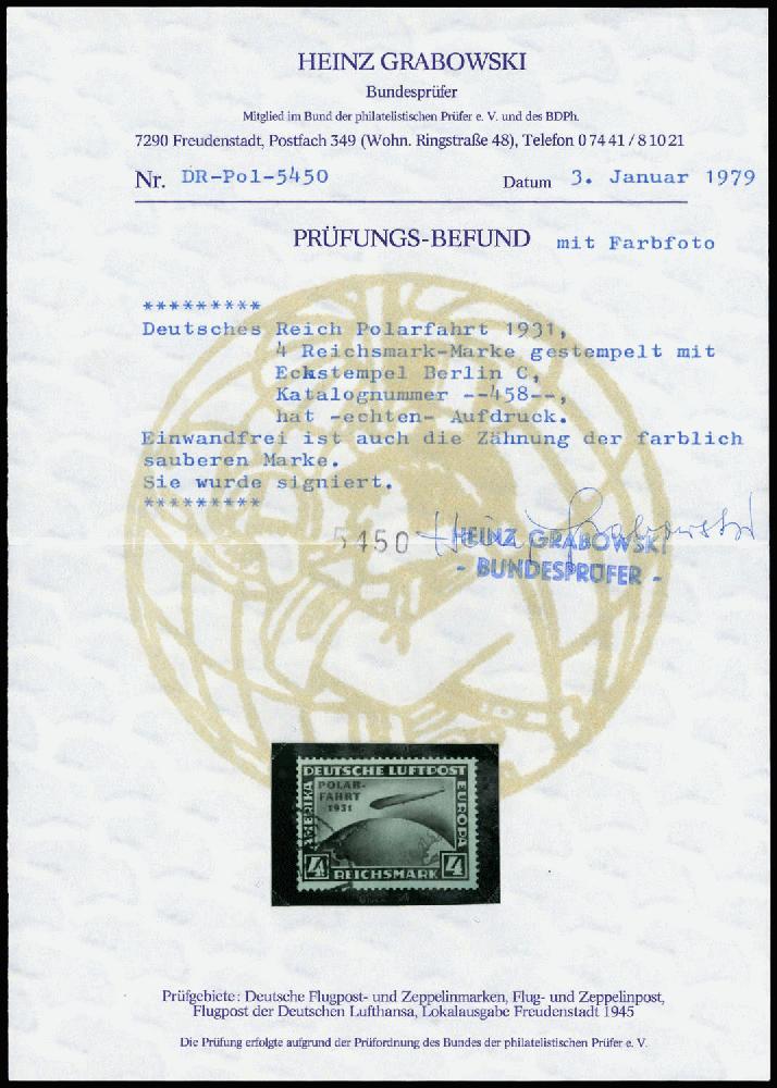 | Zusatzinformationen und Suchstichworte: | 77. Badische Briefmarken GmbH Auktion 28. Dezember 2023 Los 2730 D Deutsches Reich, 1923/32 Weimarer Republik 1931, 4.- Mark legendäre Polarfahrt gestempelt, Fotoattest und bestgeprüft Grabowski BPP " echter Aufdruck .... einwandfrei ist auch die Zähnung der farblich sauberen Marke ..." (ME 900.-) GEBOT |