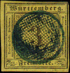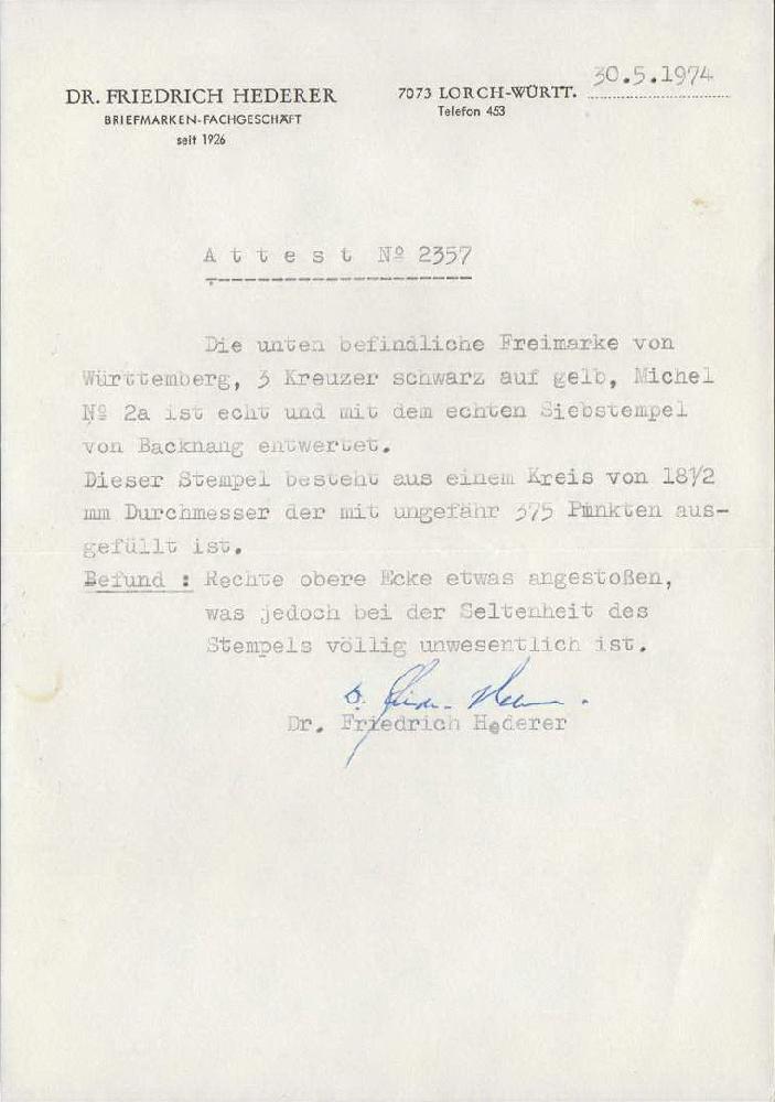 | Zusatzinformationen und Suchstichworte: | 111. Briefmarken Lenz Auktion 6. - 9. November 2023 Los 4385 Altdeutschland Württemberg "BACKNANG", blauer Siebstempel auf 3 Kr. schwarz auf gelb, vollrandige Marke echt, ohne heimliche Mängel und nicht repariert, sehr seltener stummer Stempel, der Ende 1851 nur ca. 4 Wochen zur Entwertung verwendet wurde. Atteste Hederer und Thoma, der die Besonderheit ausführlich beschreibt, Handbuch 3.500 P Ausruf 1.500,00 EUR |