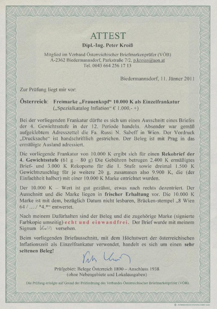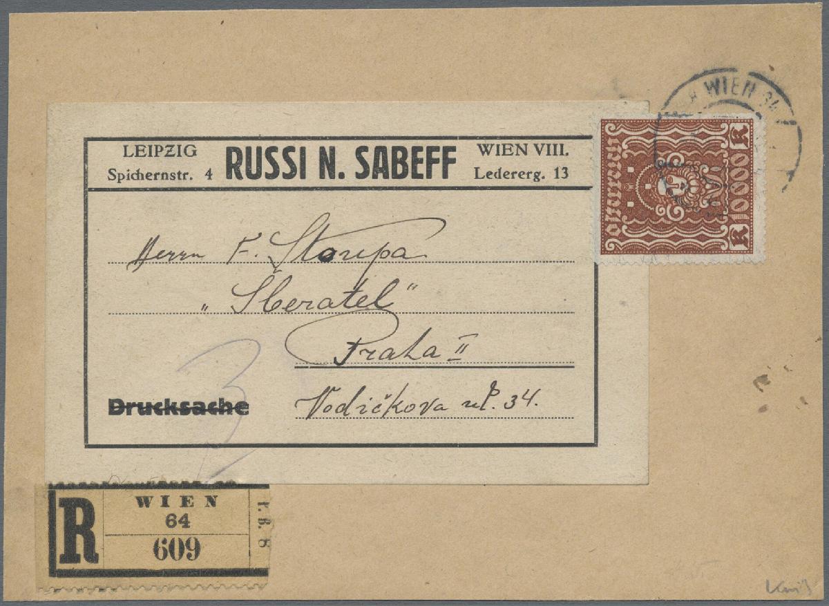 | Zusatzinformationen und Suchstichworte: | Christoph Gärtner 57. Auktion 16. - 20. Oktober 2023 Los 3922 D Österreich 1922, Frauenkopf, 10000 Kr. schwarzbraunorange, als seltene Einzelfrankatur aus Auslands-Reco-Brief der 4. Gewichtsstufe aus Wien nach Prag (Porto begünstigter Auslandsbrief der 4. Gewichtsstufe: 6900 Kr. + Reco 3000 Kr. = 9900 Kr., ein sehr seltener Beleg Zuschlag 300,00 EUR |