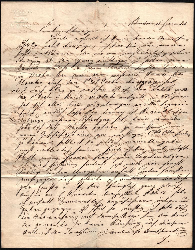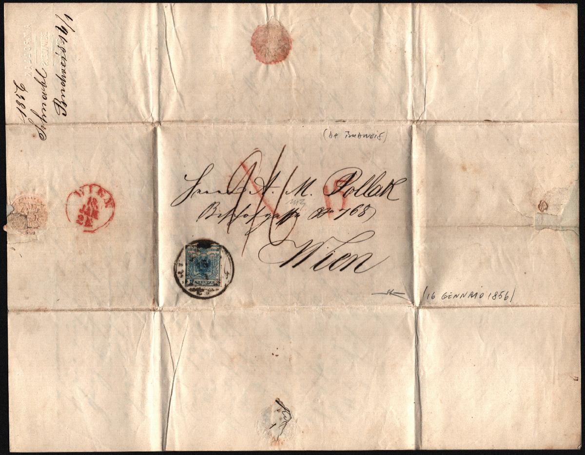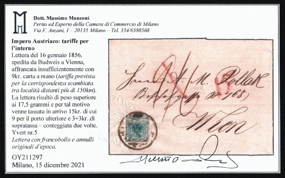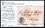 | Zusatzinformationen und Suchstichworte: | Dott. Manzoni gibt Handpapier an, meiner Meinung nach handelt es sich um Maschinpapier, Type IIIb Versuch einer Übersetzung: Österreichisches Kaiserreich: Inlandsgebühren Brief vom 16. Januar 1856, geschickt von Budweis nach Wien, unzureichend frankiert mit 9 Kreuzer Handpapier (Gebühr für Korrespondenz zwischen Standorten, die mehr als 150 km entfernt sind). Es wurde festgestellt, dass der Brief mehr als 17,5 Gramm wog und aus diesem Grund bei der Ankunft eine Gebühr von 15 Kreuzer erhoben wurde, davon 9 für das weitere Porto und 3+3 Kreuzer Zuschlag - doppelt gezählt. Yvert Nr.5 Brief mit Original-Marke und Stempeln. |