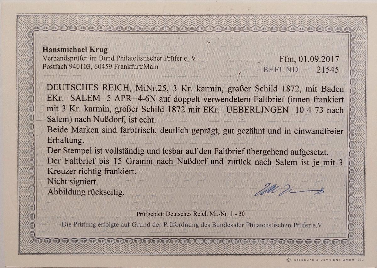 | Zusatzinformationen und Suchstichworte: | Brief, doppelt verwendeter Faltbrief, beide Verwendungen mit Michelnr. 25, Stempel SALEM 5 APR 4-6N und UEBERLINGEN 10 4 73, portogerecht, enwandfrei |