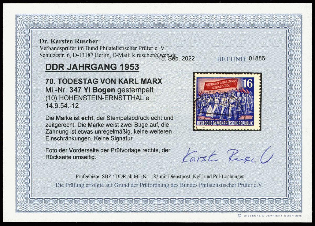 | Zusatzinformationen und Suchstichworte: | ebay.de DDR 1953, MiNr. 347 YI, zeitgerecht gestempelt, Befund Ruscher, Mi. -,- Ausruf 149,90 EUR |
