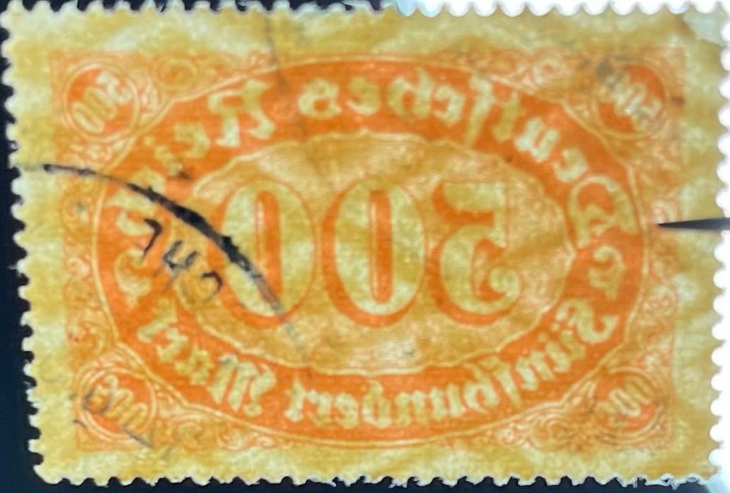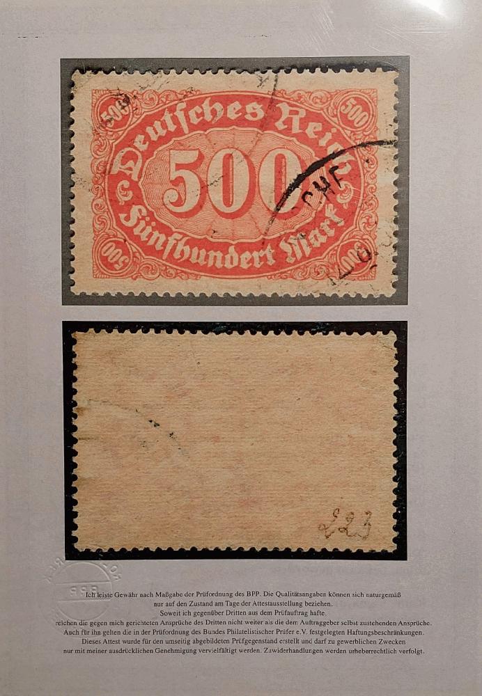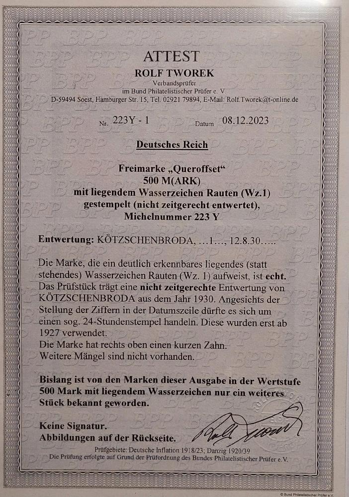 | Zusatzinformationen und Suchstichworte: | Mi-Nr. 223 (500 Mark) mit liegendem statt stehendem Wasserzeichen 1 (Rauten). Laut Attest Tworek BPP handelt es sich hier um das zweite bekannt gewordene Exemplar. Die Briefmarke weist eine nicht zeitgerechte Entwertung von 1930 auf (außerhalb der Gültigkeit). Dies ändert dennoch nichts an der Seltenheit des Stückes (daher das Fotoattest). Ein Druckbogen wies seinerzeit acht Schalterbogen à 50 Briefmarken auf, gesamt 400 Briefmarken pro Druckbogen, welche gedruckt worden sind. In der Reichsdruckerei in Berlin muss mindestens ein Schalterbogen der anschließenden Qualitätskontrolle entgangen sein. Das erste Exemplar wird in der PhilaDB gezeigt: http://philadb.com/?site=list&catid=&catuid=484&id=560 Im Infla-Bericht 17 (neue Folge) von Februar 1957 wird auf Seite 18 über ein Infla-Treffen vom 15.09.1955 berichtet, wo Albert Burneleit (Infla-Prüfer) das erste Exemplar erstmals der Öffentlichkeit vorstellt: https://www.infla-berlin.de/17_Daten/Berichte/NF/17-48.pdf?m=1588422547& |