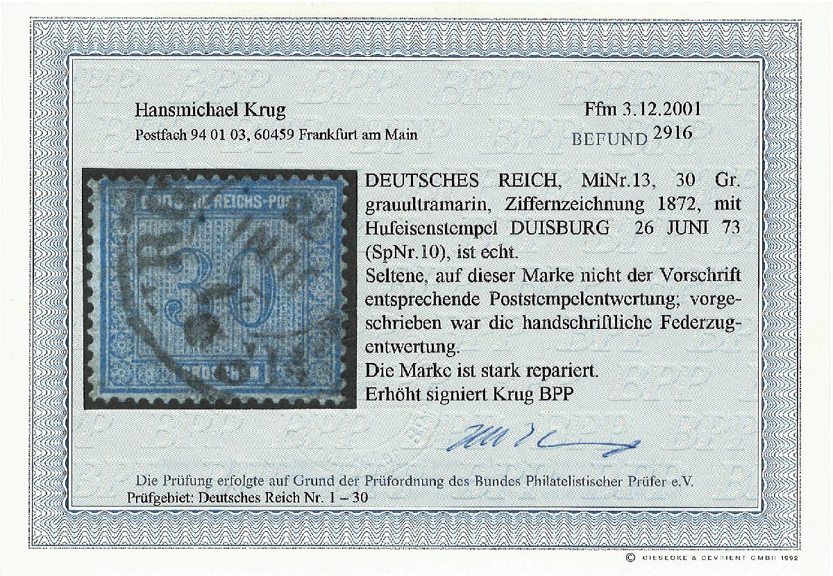 | Zusatzinformationen und Suchstichworte: | Deutsches Reich Nr. 13 repariert |