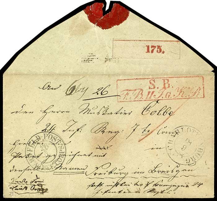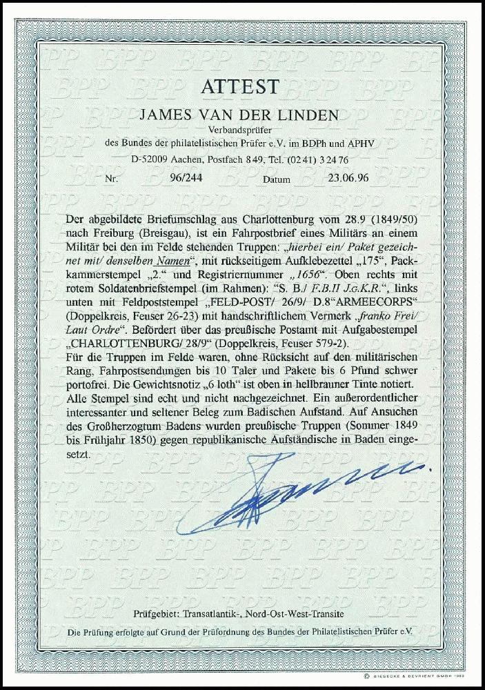 | Zusatzinformationen und Suchstichworte: | Dr. Reinhard Fischer 196. Auktion 1. - 3. Februar 2024 Los 25 Altdeutschland Baden 1849, Fahrpostbrief mit K2 "CHARLOTTENBURG 18/9" nach Freiburg im Breisgau mit K2 "FELD-POST D.8.ARMEECORPS" (Feuser 26/23) und Truppen Ra2 "S.B./F.B. II J.G.K.R" in rot (Soldatenbriefstempel für die Truppen in Baden), es handelt sich um einen Paketbegleitbrief; Militär-Militär, mit rückseitigem Einlieferungszettel "175", ein außerordentlich interessanter und seltener Beleg zum badischen Aufstand, Auf Ansuchen Badens wurden preußische Truppen gegen Republikanische Aufständige in Baden eingesetzt, hervorragende Gesamterhaltung, ausführliches Fotoattest James van der Linden BPP Ausruf 1.000,00 EUR |