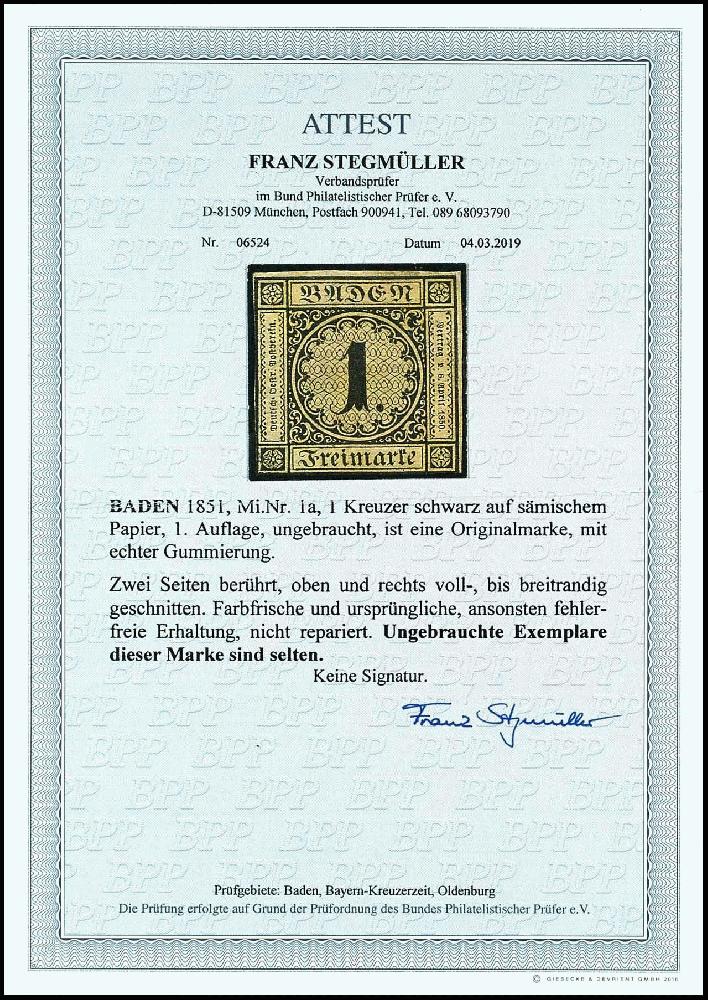 | Zusatzinformationen und Suchstichworte: | Dr. Reinhard Fischer 196. Auktion 1. - 3. Februar 2024 Los 42 Altdeutschland Baden 1 Kreuzer schwarz auf sämischem Papier, 1. Auflage, ungebraucht mit Originalgummierung, zwei Seiten berührt oben und rechts voll- bis breitrandig geschnitten, farbfrische und ansonsten fehlerfreie Erhaltung, unsigniert, Fotoattest Franz Stegmüller BPP "Ungebrauchte Exemplare dieser Marke sind selten.", Mi. 2.500.- Ausruf 500,00 EUR |