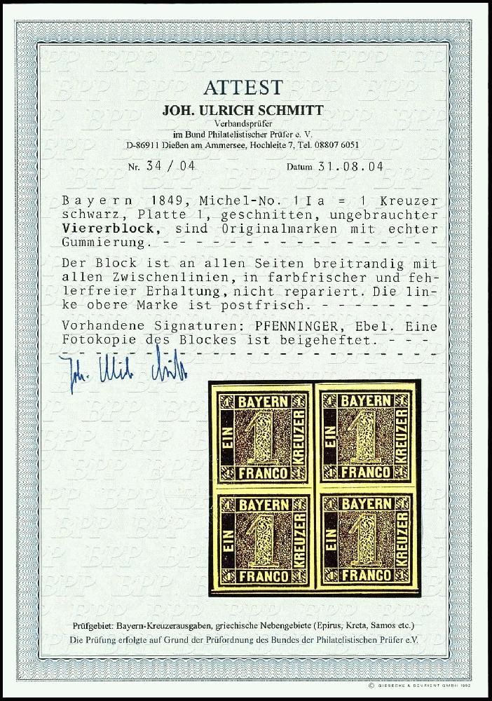 | Zusatzinformationen und Suchstichworte: | Dr. Reinhard Fischer 196. Auktion 1. - 3. Februar 2024 Los 8000 Altdeutschland Bayern 1 Kreuzer schwarz, Platte I, breitrandig geschnittener Viererblock mit allseits sichtbaren Zwischenlinien, farbfrisches Kabinettstück, linke obere Marke postfrisch - die anderen Werte sauber ungebraucht mit Originalgummierung, geprüft Pfenninger, Ebel und Fotoattest Joh. Ulrich Schmitt BPP "in farbfrischer und fehlerfreier Erhaltung." - ein schönes Stück der ersten deutschen Briefmarke! Ausruf 2.500,00 EUR |