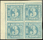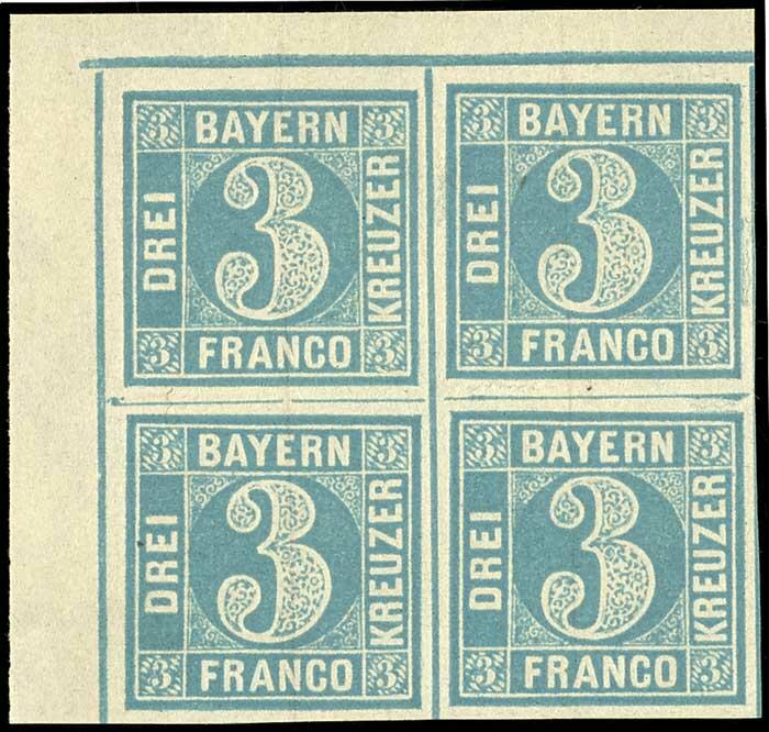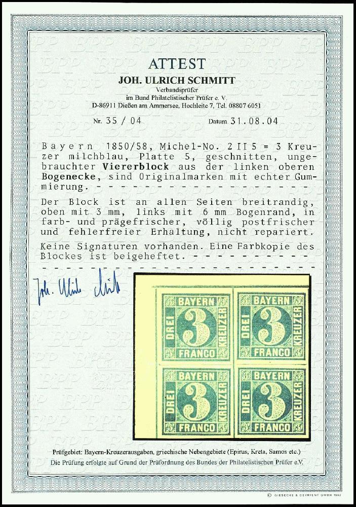 | Zusatzinformationen und Suchstichworte: | Dr. Reinhard Fischer 196. Auktion 1. - 3. Februar 2024 Los 8001 Altdeutschland Bayern 3 Kreuzer lichtblau, Type II, Platte 5, Eckrandviererblock oben links mit allseits breitrandigem Schnitt und links 6 mm sowie oben 3 mm Bogenrand, postfrisch in tadelloser Ausnahmequalität ohne jegliche Signaturen, Fotoattest Joh. Ulrich Schmitt BPP "prägefrischer, völlig postfrischer und fehlerfreier Erhaltung." Ausruf 800,00 EUR |