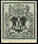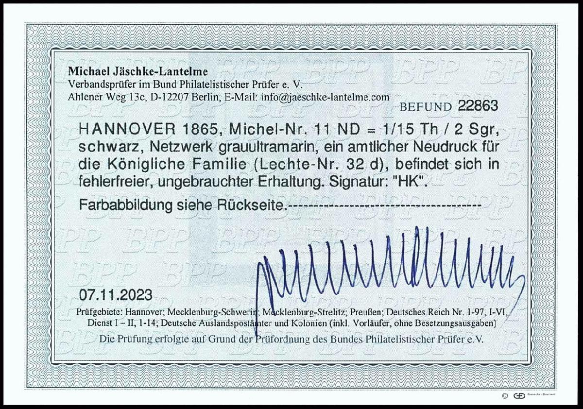 | Zusatzinformationen und Suchstichworte: | Dr. Reinhard Fischer 196. Auktion 1. - 3. Februar 2024 Los 314 Altdeutschland Hannover 1/15 Thaler / 2 Silbergroschen, schwarz, Netzwerk grauultramarin, amtlicher Nachdruck für die königliche Familie (Lechte Nr 32d), ungebraucht, tadellose Erhaltung, geprüft HK (Horst Krause, Gelsenkirchen) und Fotobefund Michael Jäschke-Lantelme BPP (2023) "in fehlerfreier, ungebrauchter Erhaltung." Ausruf 100,00 EUR |