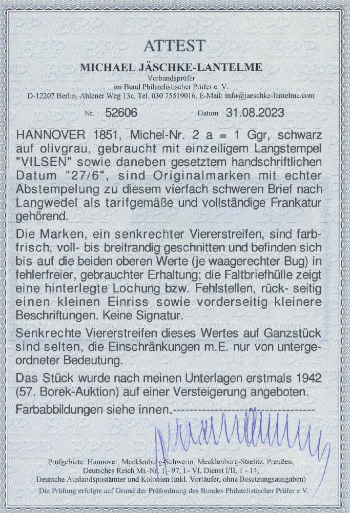 | Zusatzinformationen und Suchstichworte: | Christoph Gärtner 58. Auktion 19. - 23. Februar 2024 Los 4280 Altdeutschland Hannover 1851, 1 Ggr. schwarz auf graugrün, senkrechter Viererstreifen, farbfrisch, allseits voll- bis breitrandig, die beiden oberen Marken je mit waagerechtem Bug, auf 4fach schwerem Brief, blauer L 1 VILSEN aufgesetzt nach Langwedel, nur wenige Viererstreifen dieser Marke auf Brief bekannt, Foto-Attest Jäschke-Lantelme BPP (2023): "Senkrechte Viererstreifen dieses Wertes auf Ganzstück sind selten, die Einschränkungen m. E. nur von untergeordneter Bedeutung" ex Borek-Auktion (1942), Mi 2000,- Ausruf 1.500,00 EUR |