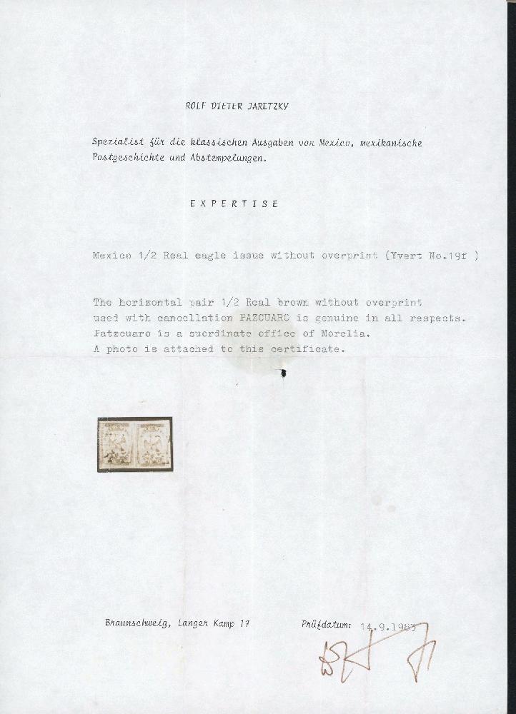 | Zusatzinformationen und Suchstichworte: | David Feldman S.A. - Alle Welt 23. November - 9. Dezember 2023 Morelia No Name bezeichnen Pazcuaro ½r braun erste Periode, Paar ringsum vollrandig, Zweizeilerstempel (Schatzkès #962), senkrechter Bug zwischen den Marken und Eckbug oben rechts. Selten. Attest Jaretzky (1983). NF $1,700 als Einzelmarken. Ex Leo V. Corbett Ausruf 800,00 EUR |
