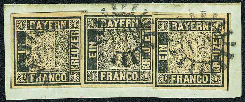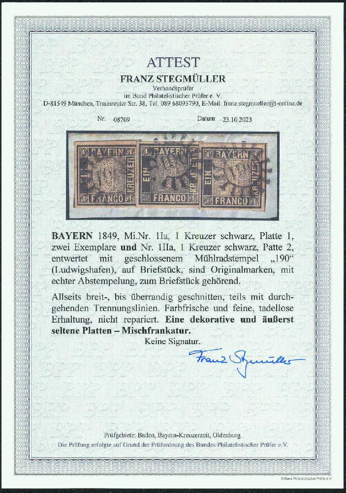 | Zusatzinformationen und Suchstichworte: | Gert Müller 121. Auktion 22. Februar 2024 Los 2207 Altdeutschland Bayern DIE SENSATIONELLE PLATTEN-MISCHFRANKATUR: 1 Kr. schwarz, Platte 1, zwei Exemplare und 1 Kr. schwarz, Platte 2, farbfrische, allseits breit- bis überrandig geschnittene Luxusstücke als spektakuläre Platten-Mischfrankatur auf wundervollem Briefstück mit drei einzeln und sauber aufgesetzten geschlossenen Mühlradstempeln "190 (LUDWIGSHAFEN)". Es handelt sich hierbei um eine ganz außergewöhnliche Neuentdeckung, die von uns in einem alten Nachlass in einer Tüte gefunden wurde. Der Sammler hatte seine Kollektion vor Jahrzehnten platzsparend in Tüten und auf Einsteckkarten untergebracht, damit sie in einem Tresor verwahrt werden konnte. Es handelt sich hierbei um eine der bedeutendsten Raritäten des Schwarzen Einsers! Fotoattest "TADELLOSE ERHALTUNG" Stegmüller BPP Ausruf 5.000,00 EUR |
