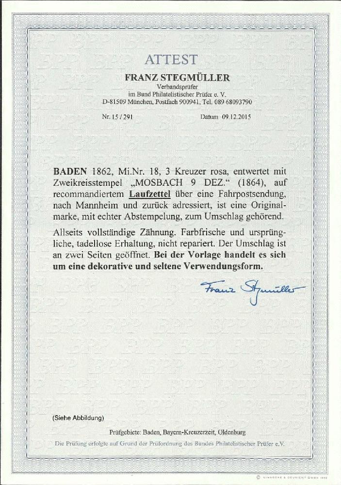 | Zusatzinformationen und Suchstichworte: | Gert Müller 121. Auktion 22. Februar 2024 Los 3727 Altdeutschland Baden 3 Kr. rosa mit zentrischem, klarem K2 "MOSBACH 9.DEZ. (1864)", tadellos auf zweiseitig geöffnetem Laufzettel nach Mannheim und zurück adressiert. Eine außerordentlich seltene Verwendungsform. Es sind nur wenige frankierte Laufzettel von Baden bekannt geworden! Fotoattest Stegmüller BPP Ausruf 1.500,00 EUR |