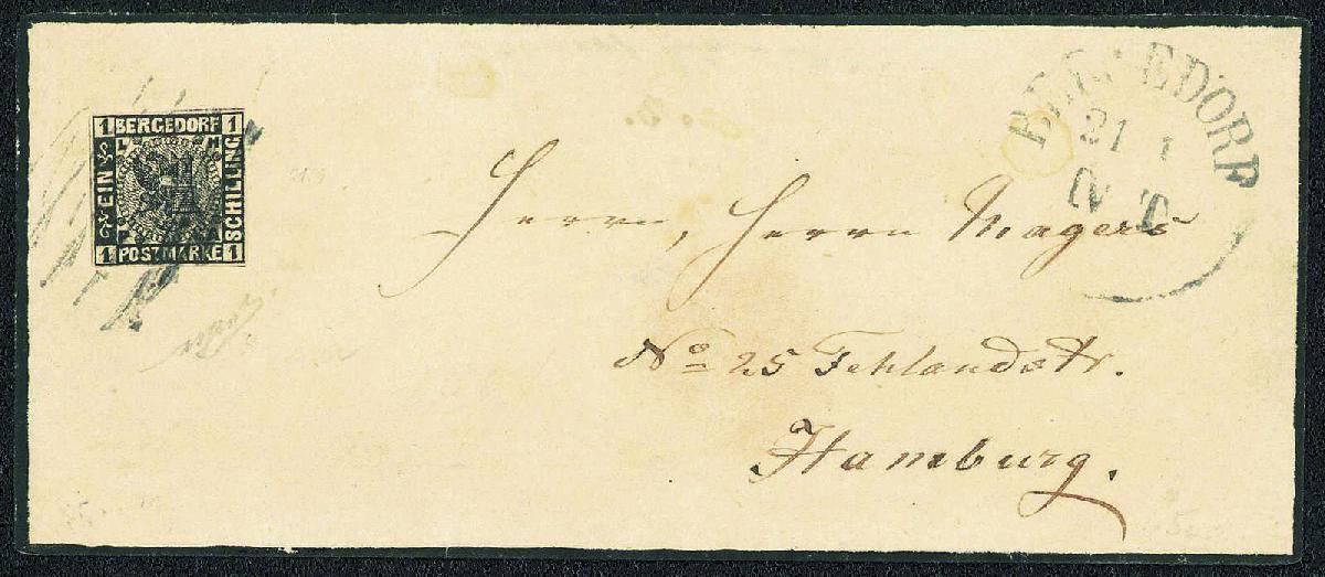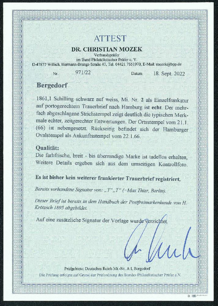 | Zusatzinformationen und Suchstichworte: | Gert Müller 121. Auktion 22. Februar 2024 Los 3829 Altdeutschland Bergedorf EIN TRAUMBRIEF VON BERGEDORF: 1 Sch. schwarz, wundervoll farbfrisches, allseits breit- bis überrandiges Luxusstück auf wunderschönem kleinformatigem Trauerbrief mit entsprechenden Strichstempeln und beigesetztem klarem Ortsstempel "BERGEDORF 21.1.(1866)" nach Hamburg mit Ankunftsstempel "HAMBURG 22.1.66.". In dieser Schnittqualität sind bereits lose gest. Bergedorf-Marken extrem selten. Briefe in dieser Spitzenerhaltung zählen zu den großen Raritäten von Altdeutschland. Ein absolutes Ausnahmestück für höchste Ansprüche. Dieser Brief wurde bereits im berühmten Krötzsch-Handbuch im Jahr 1895 abgebildet. Es ist zudem der einzig bekannte frankierte Trauerbrief von Bergedorf. Fotoattest "TADELLOS ERHALTEN" Dr. Mozek BPP Ausruf 5.000,00 EUR |