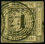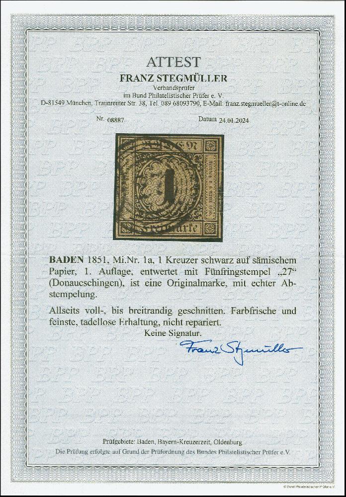 | Zusatzinformationen und Suchstichworte: | 383. Auktion Heinrich Köhler Auktionstermin 14.–15. & 18.–23. März 2024 Los 3659 Altdeutschland Baden 1 Kr. auf sämisch, farbfrisch und voll- bis breitrandig, sauber entwertet durch Nr. "27" DONAUESCHINGEN, tadellos, Fotoattest Stegmüller BPP (2024) Ausruf 200,00 EUR |