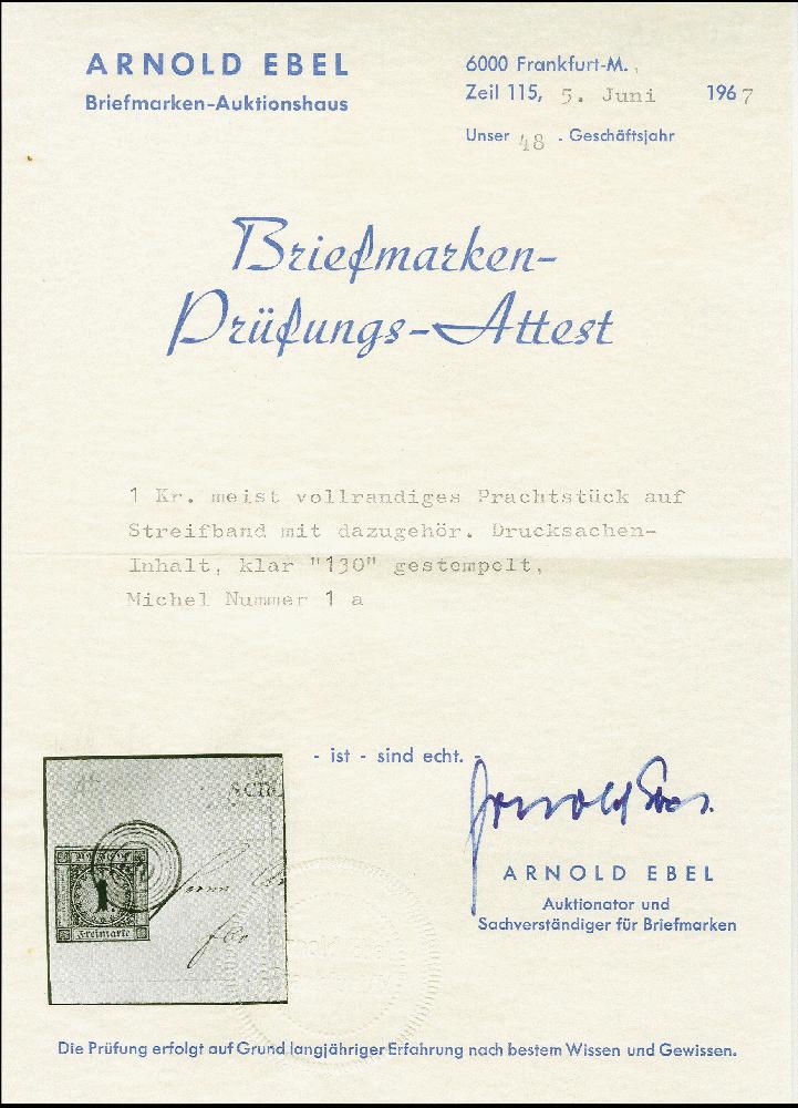 | Zusatzinformationen und Suchstichworte: | 383. Auktion Heinrich Köhler Auktionstermin 14.–15. & 18.–23. März 2024 Los 3660 Altdeutschland Baden 1 Kr. auf sämisch, farbfrisch, leicht berührt bis überrandig, oben links mit Teil der Nachbarmarke, mit klar aufgesetzter Nr. "130" und sauber nebengesetztem Langstempel "SCHOPFHEIM" auf streifbandähnlich gefalteter Drucksache nach Kadellburg. Außerhalb der Frankatur senkrecht gefaltet, sonst einwandfrei. Ein attraktives Stück. Fotoattest Stegmüller BPP (2024) Ausruf 400,00 EUR |