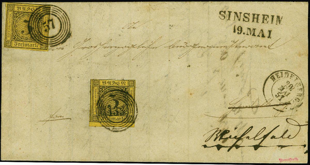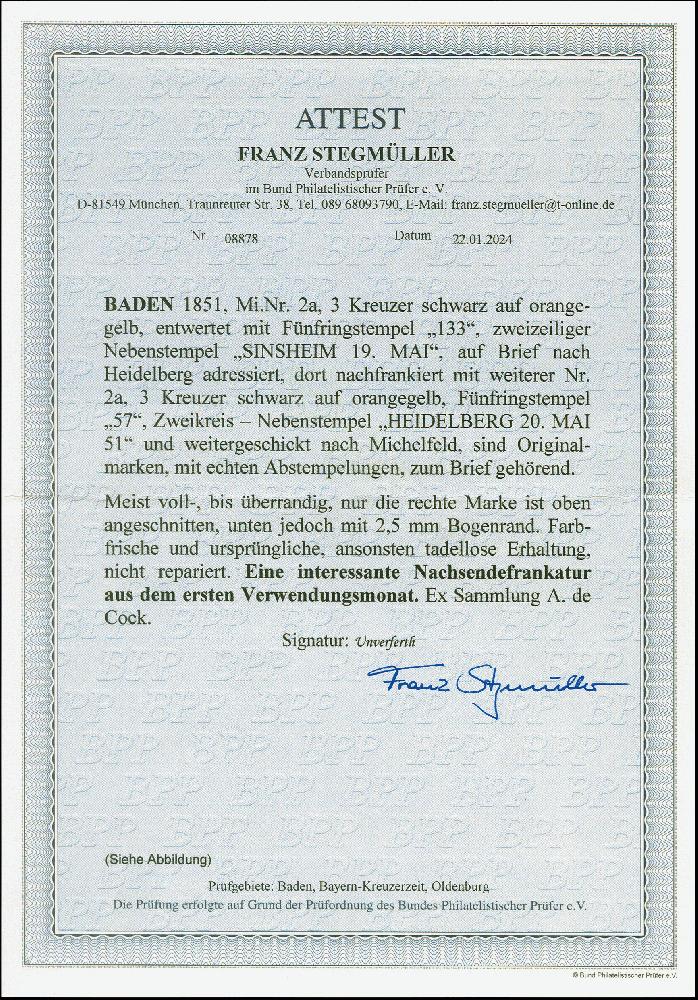 | Zusatzinformationen und Suchstichworte: | 383. Auktion Heinrich Köhler Auktionstermin 14.–15. & 18.–23. März 2024 Los 3664 Altdeutschland Baden 3 Kr. auf orangegelb, 2 Einzelwerte, einer oben etwas angeschnitten, sonst beide voll- bis überrandig, auf komplettem Faltbrief. Zunächst mit Nr. "133" und sauber nebengesetztem L2 "SINSHEIM 19. MAI" nach Heidelberg, hier neu frankiert und mit Nr. "57" und sauber nebengesetztem DKr. "HEIDELBERG 20 MAI 51" nachgesandt nach Michelfeld. Ein attraktiver und in dieser Form seltener Brief in frischer und sonst tadelloser Erhaltung.. Fotoattest Stegmüller BPP (2024) Ausruf 200,00 EUR |