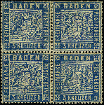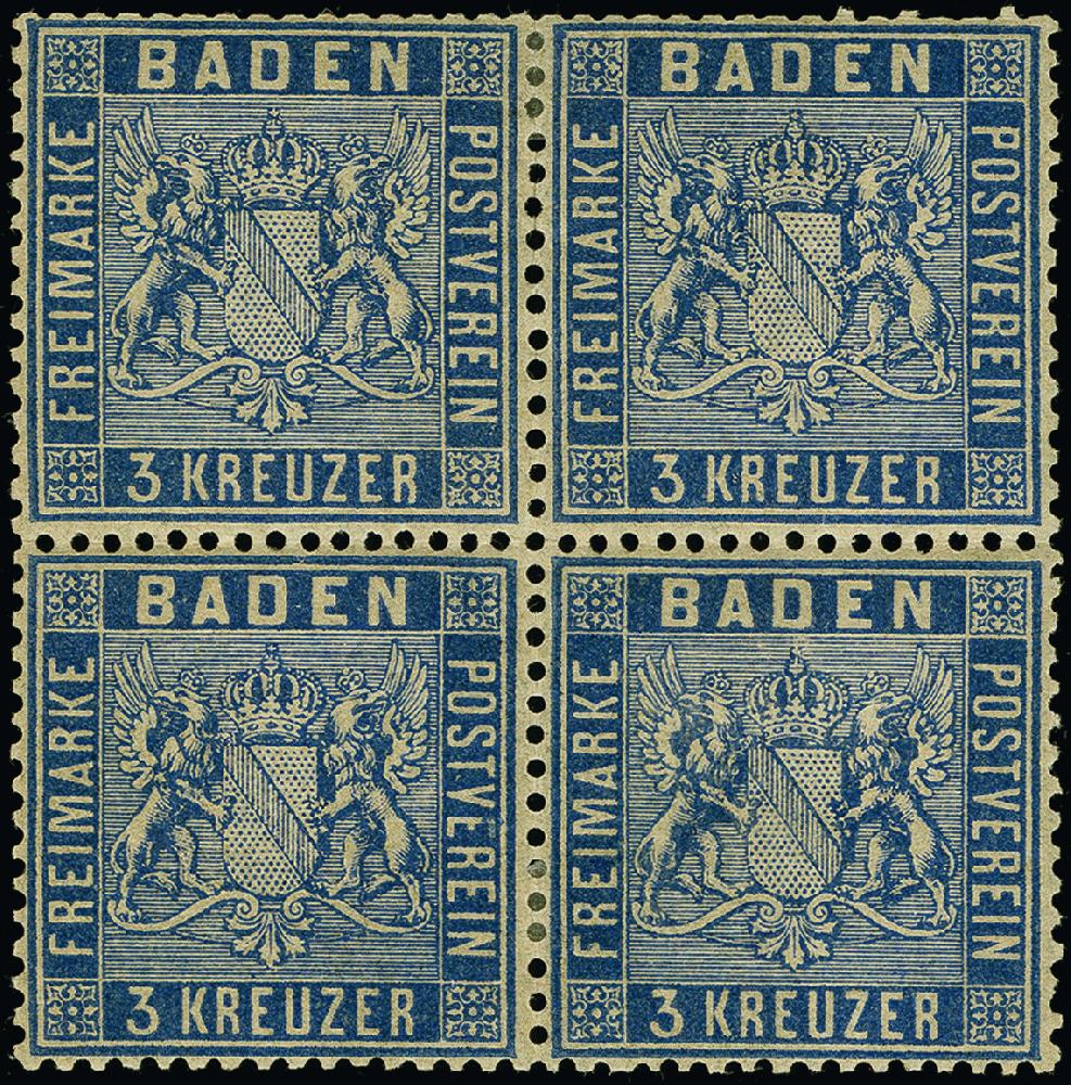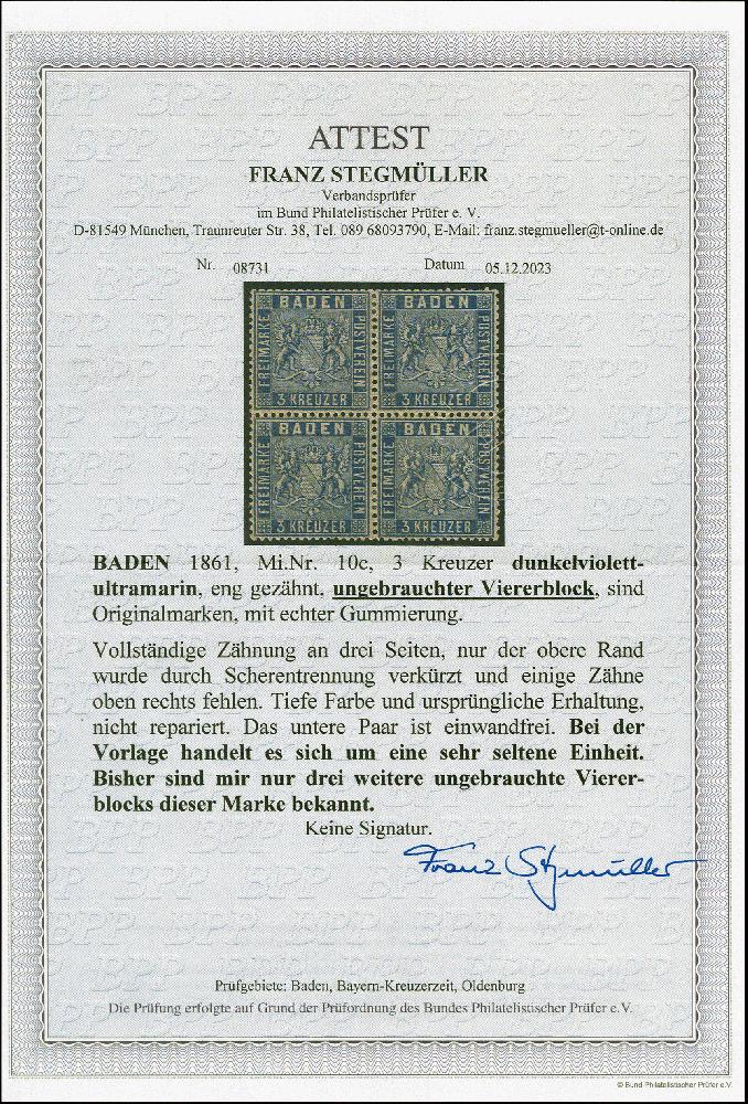 | Zusatzinformationen und Suchstichworte: | 383. Auktion Heinrich Köhler Auktionstermin 14.–15. & 18.–23. März 2024 Los 3667 Altdeutschland Baden 3 Kr. veilchenblau im Viererblock, ungebraucht mit Originalgummi. Schöne typische tiefe Farbe, dreiseitig gut gezähnt, oben die Zähnung durch Scherentrennung etwas verkürzt bzw. rechts einige Zähne fehlend, sonst einwandfrei. Ein insgesamt attraktiver und frischer Block der seltenen Farbe; es sind nur 3 weitere Viererblocks als größte ungebrauchte Einheiten dieser Marke registriert. Private Signaturen und Fotoattest Stegmüller BPP (2023) Ausruf 2.000,00 EUR |