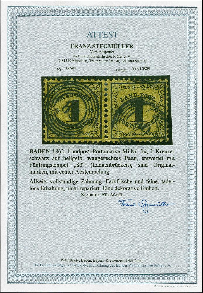 | Zusatzinformationen und Suchstichworte: | 383. Auktion Heinrich Köhler Auktionstermin 14.–15. & 18.–23. März 2024 Los 3670 Altdeutschland Baden Landpost 1862, 1 Kr. auf hellgelb im waagerechten Paar je mit Nummer "80" in tadelloser Erhaltung, farbfrisches und dekoratives Paar, sign. Kruschel und Fotoattest Stegmüller BPP (2020) Ausruf 250,00 EUR |